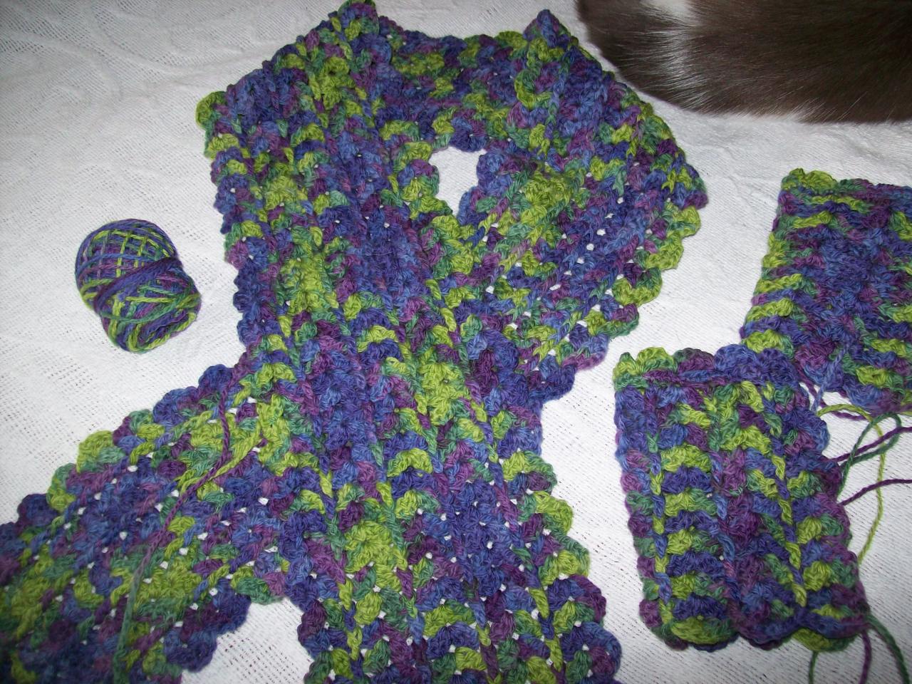 First, this scarf. I decided 4 feet long was enough, leaving enough yarn for a hat or mitts. I tried to make a hat with the same stitch, but after 3 tries gave up. The pattern is too flexible, I think - all my attempts to make the starting circle turn into a hat shape just gave me a bigger flat circle, so I rolled the yarn back up and simply made 2 rectangles to sew into fingerless mitts, leaving a hole for the thumb.