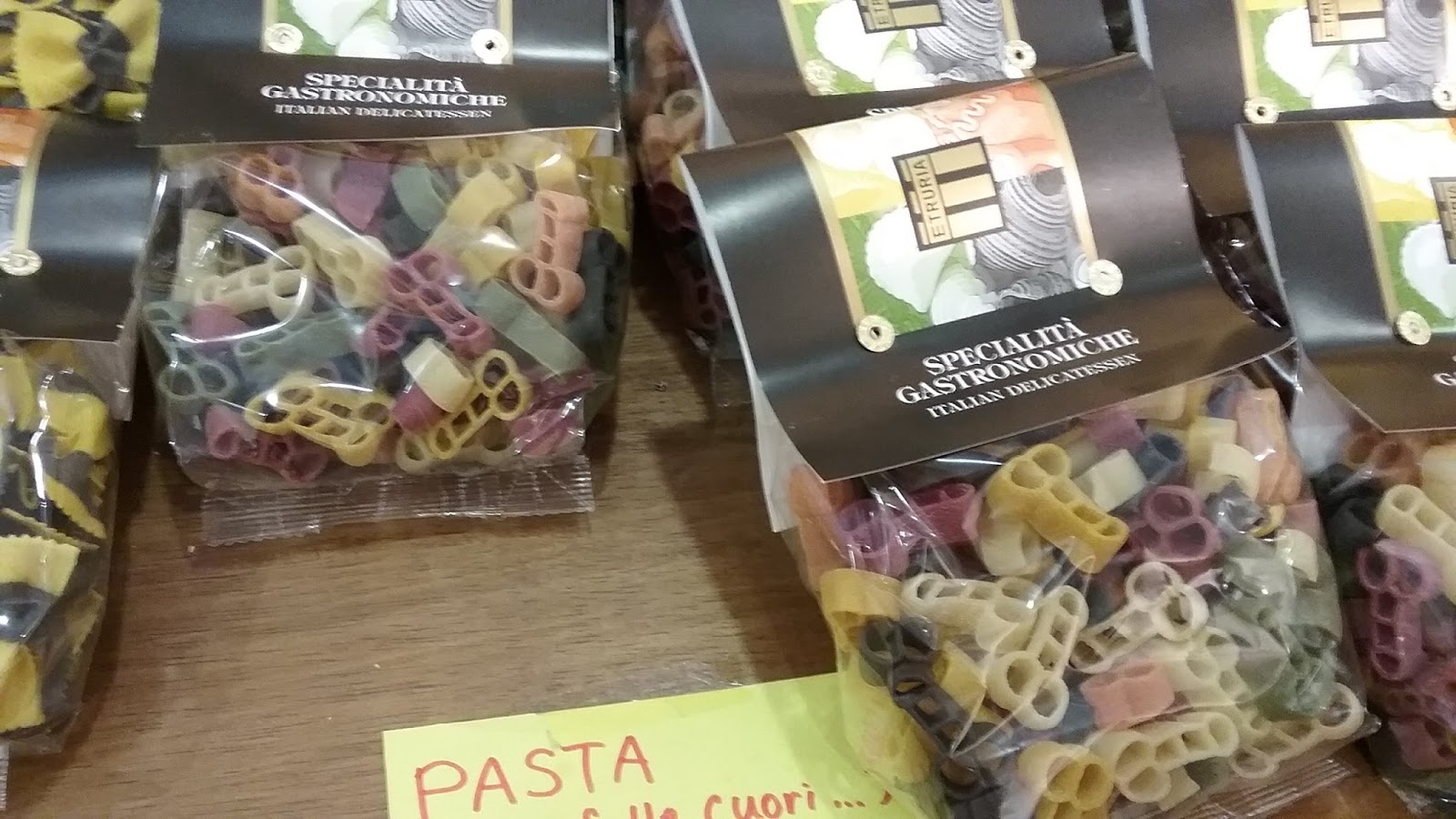 We got on a bus to Tuscany, and I made calculations on time, distance, and bladder capacity before consuming the Coke. We stopped halfway at a place with bathrooms that also sold (and had many samples of) bottles of olive oil, sauces, vinegars, chocolates, pasta, cheese, meats, etc. You could sample enough to keep you fed for a while, and I pondered some excellent cheeses but decided it would stink up my luggage and room. One item was salted, preserved mullet roe (thanks, Google Translate!). They also served coffee, much to the relief of many of the passengers. Here's a sample of their wares: